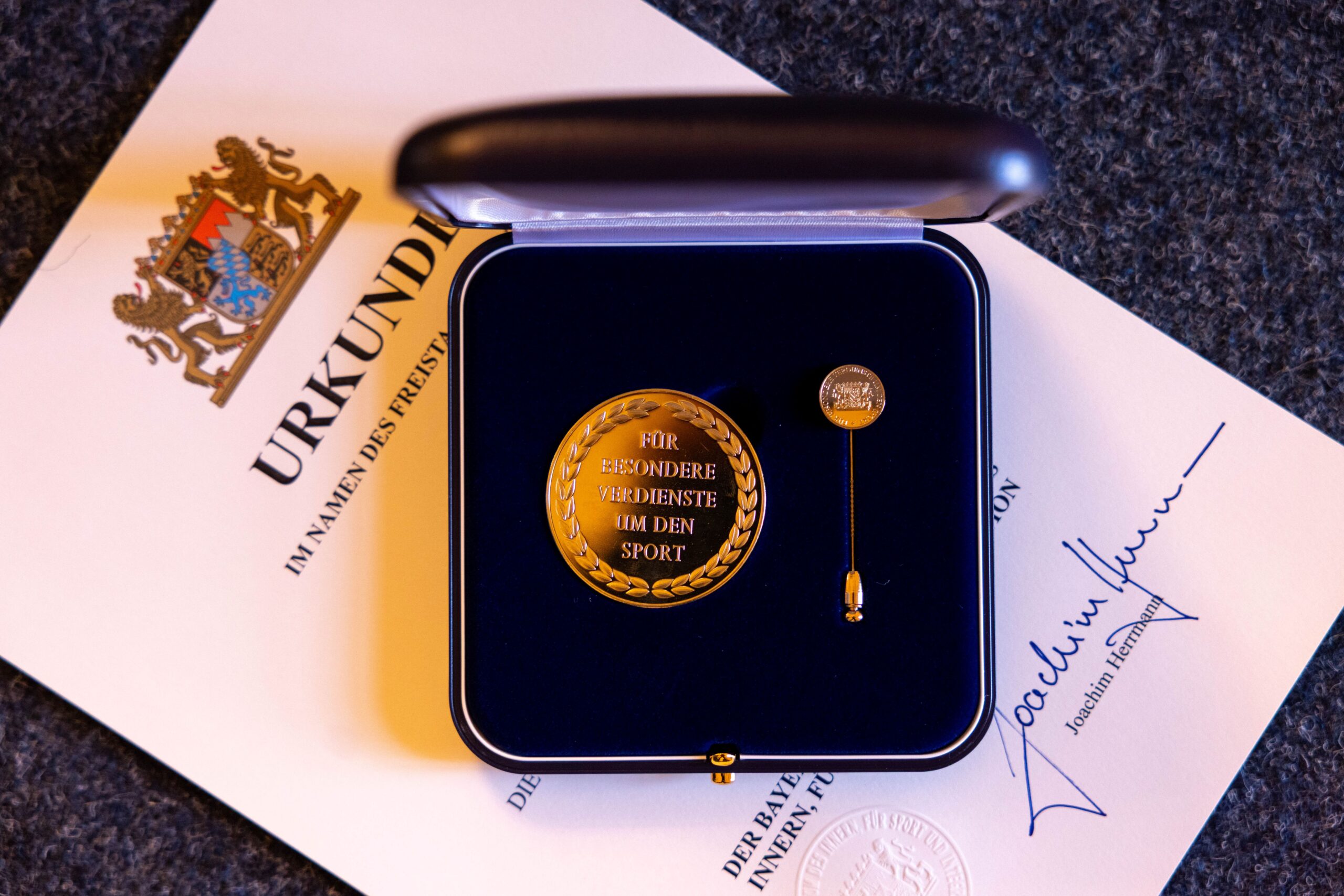 Die Verleihung erfolgte im feierlichen Rahmen durch den Bayerischen Staatsminister des Innern, für Sport und Integration, Joachim Herrmann, MdL. Insgesamt wurden im Rahmen der Veranstaltung 57 Persönlichkeiten aus ganz Bayern für ihr außergewöhnliches Engagement im Sport geehrt. Mit dieser hohen Auszeichnung würdigt der Freistaat Bayern Persönlichkeiten, die sich in besonderer Weise und über viele Jahre hinweg um den Sport verdient gemacht haben.